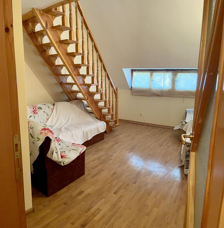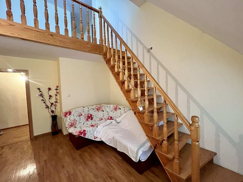 МЕЗОНЕТ с ГАРАЖ - Градска част, тухла, газ в сградата, акт 16, 110 кв.м., ет.4, юг-север, състоящ се от: 1-во ниво - кухня, дневна със стълбище към 2-то ниво, спалня, сан. възел - баня и тоалетна (общо помещение) - фаянс и теракота, тераси пред кухня и спалня, 2-ро ниво - две спални и сан.възел - фаянс и теракота, коридор - гранитогрес, стаи - паркет, стени - латекс, мазе, подблоков гараж - 20 кв.м.
