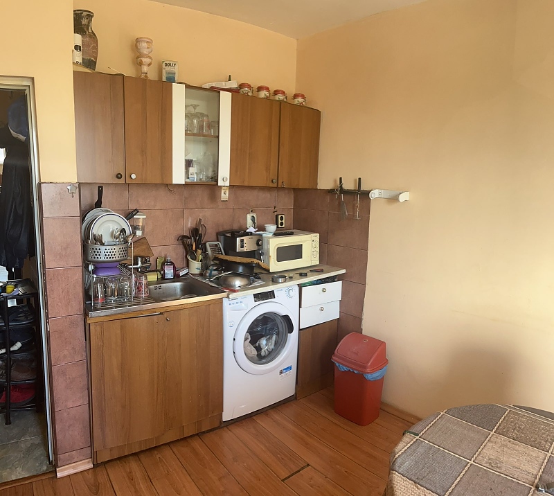 ГАРСОНИЕРА - Стария пазар, тухла, без ТЕЦ, ет.4/8, 38 кв.м., изток, вътрешен ап., PVC дограма, състои се от кухня, стая - спалня и сан.възел, кухня и стая - стени - тапети, кухня - под - ламиниран паркет, стая - естествен паркет, коридор - теракота, сан.възел - фаянс и теракота, мазе